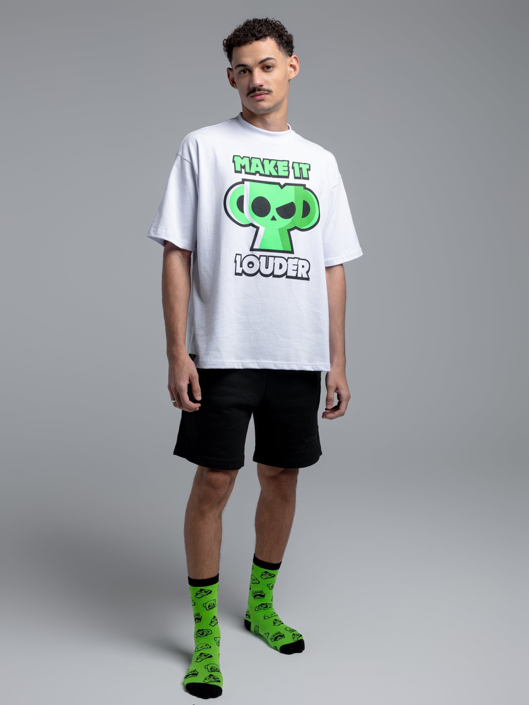 A Camiseta Oversized Branca LOUD x Brawl Stars, traz estampa icônica em destaque nas cores verde LOUD, acompanhado do lema que define a collab: MAKE IT LOUDER. Uma peça que une diversão e atitude gamer, com visual marcante e cheio de personalidade.